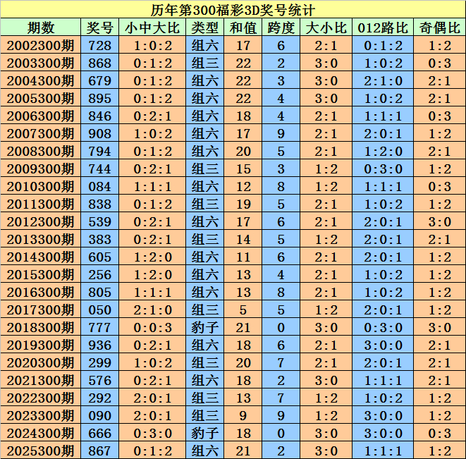 开奖总结:福彩3D第2025300期奖号为:867。